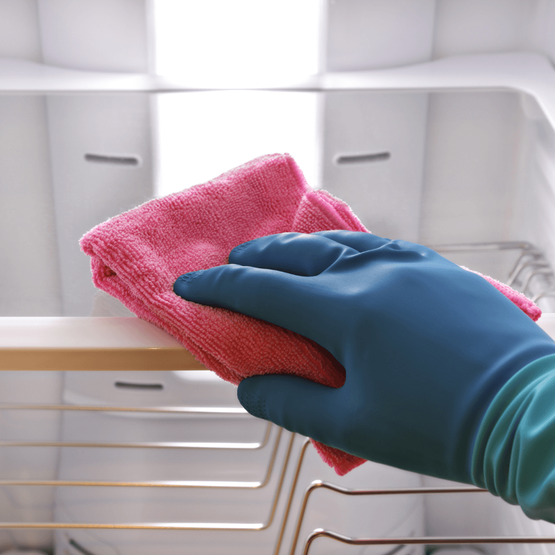 Börja med att plocka bort kylskåpsmagneter och andra saker som sitter på kylskåpet. Du kan antingen använda vanligt diskmedel eller ättikssprayen vi nämnde tidigare. Torka sedan utsidan ordentligt och var extra noga vid handtaget.